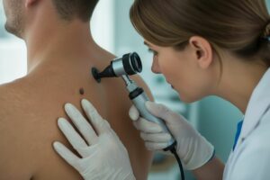 Для того, чтобы определить наличие меланомы у пациента, врач берет материал на биопсию. Показания для биопсии — размер пигментного поражение более 0,6 сантиметров, неровные и нечеткие плавучие границы, неравномерный окрас, наличие язв, кровотечения или резкая смена формы и размеров родинки. Чтобы определить степень заболевания, глубину проникновения и наличие метастаз назначают дополнительные исследования — рентген грудной клетки, УЗИ брюшной полости, КТ и МРТ, а также сканирование с помощью радиоактивных изотопов.